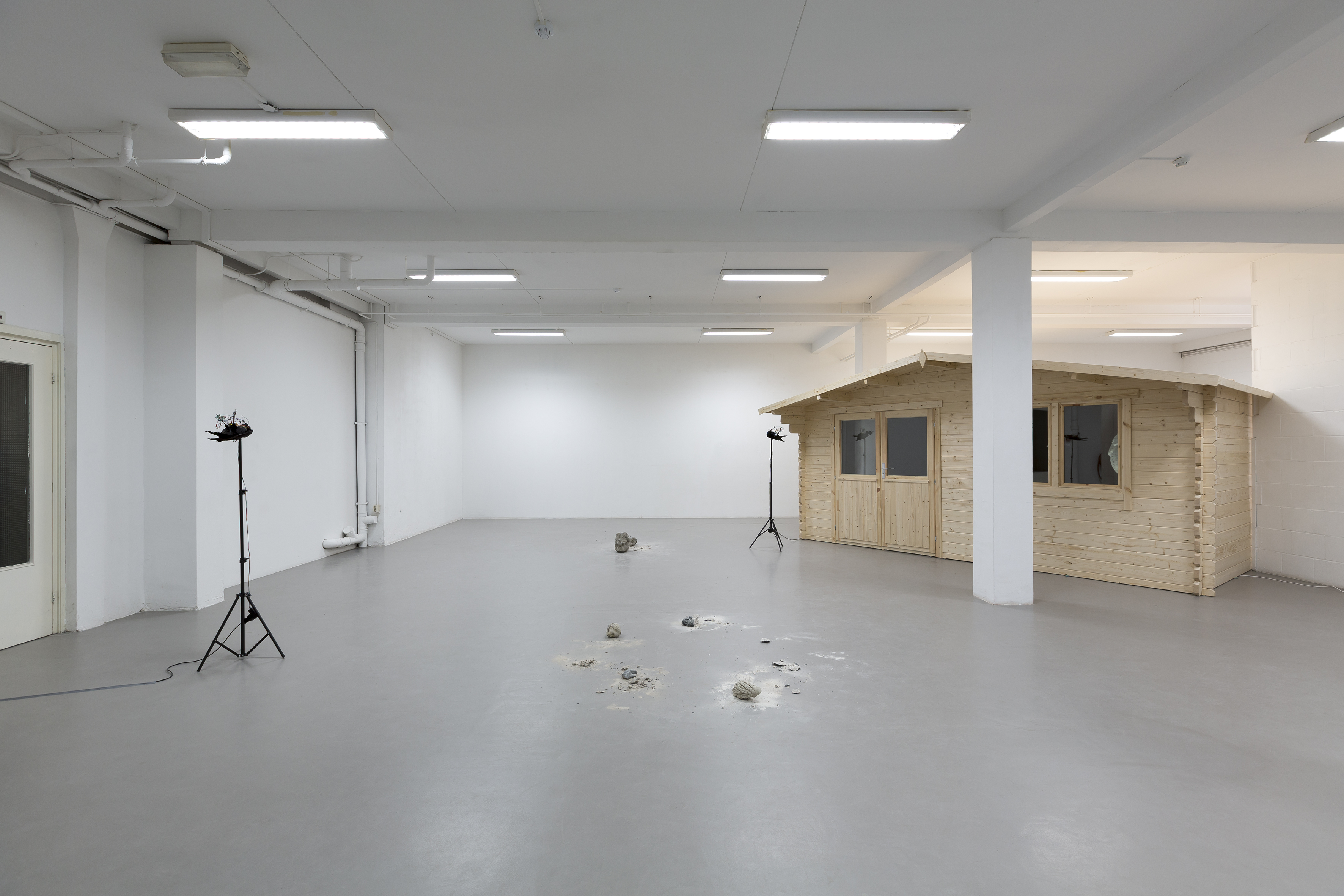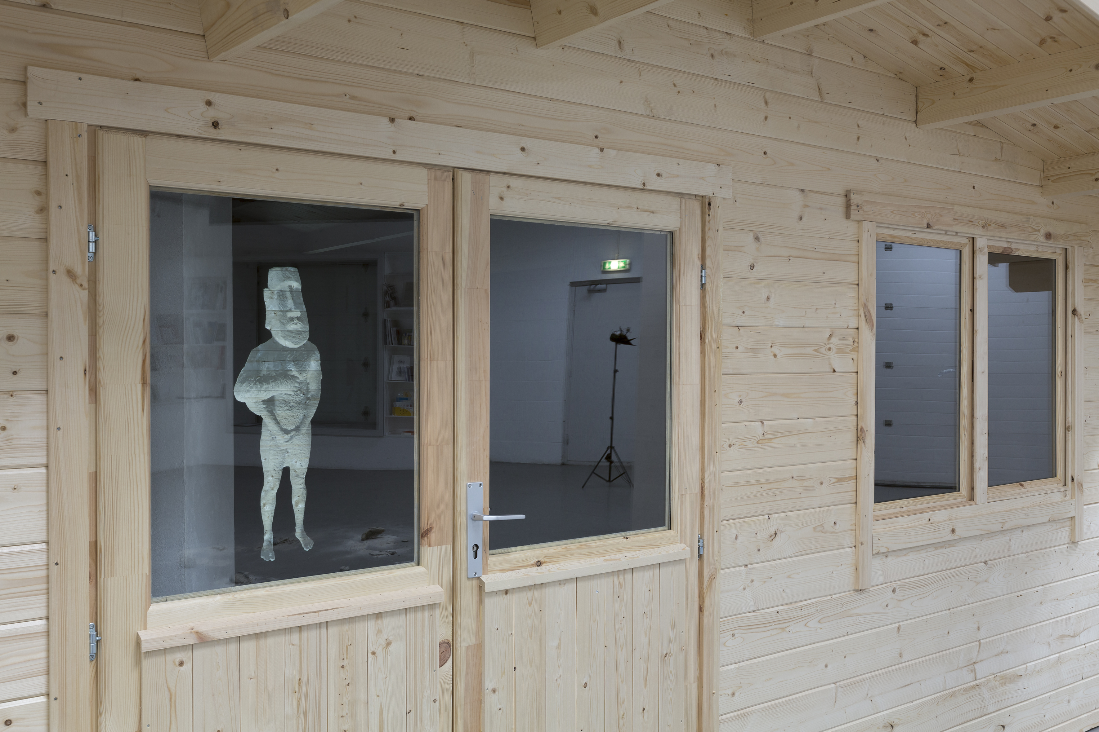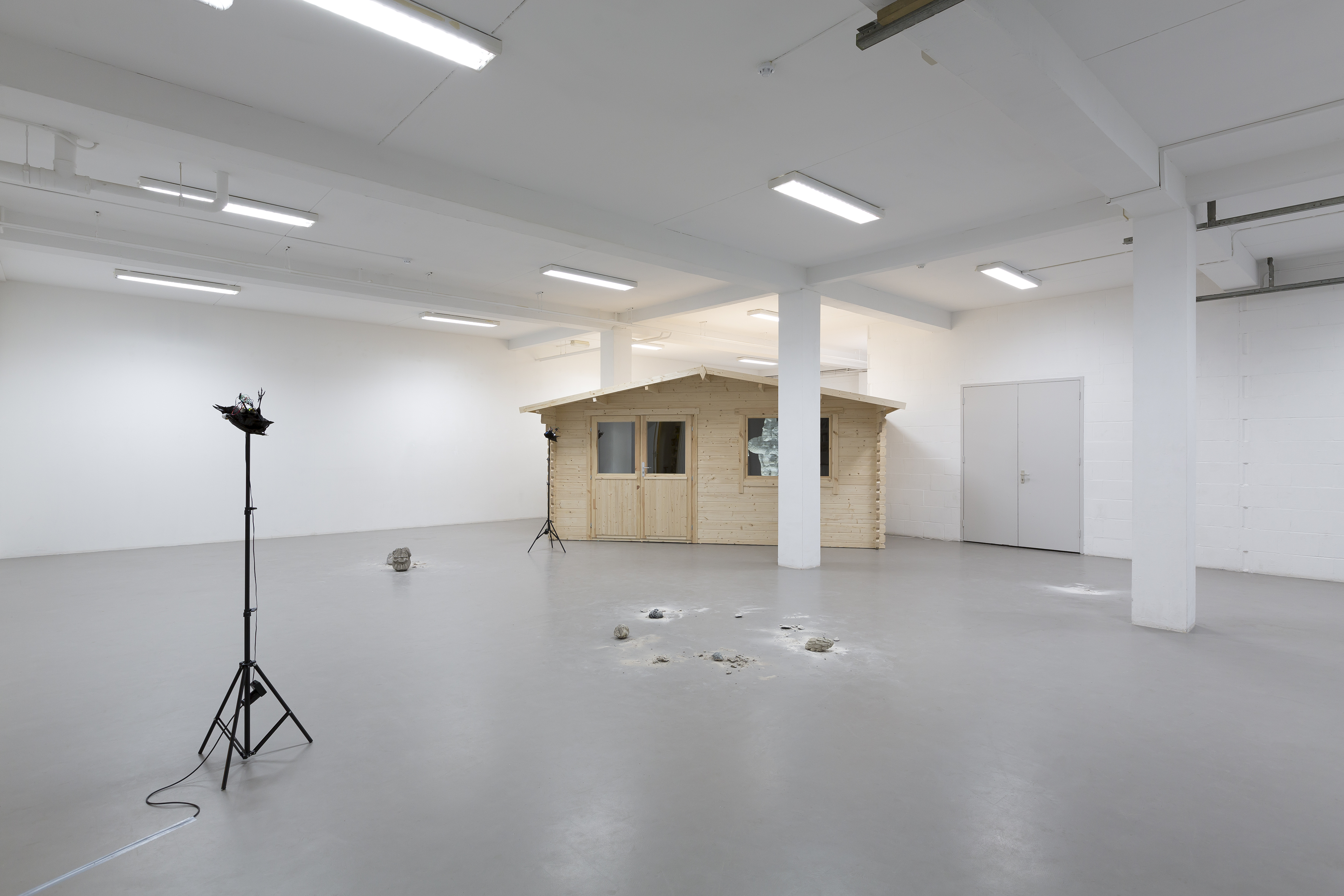 Three reanimated crows – inspired by their plastic lookalikes placed in gardens to scare away pigeons, and animatronics found in haunted house rides – 'greet' the visitor as they cross the threshold and wander through the exhibition space; turning them into an intruder. Within the space, the crows create a domain of privacy and secrecy that is inherent to most backyards. The electronics, attached on the outside of the birds instead of being concealed within, function as external organs meant to force the stuffed crows to speak. It is a single voice, belonging to one crow, that echoes its way through the second and has almost disappeared by the time it reaches the third. Backed into the corner, slightly lifted from the floor, stands the untreated and vulnerable prefab garden house that, instead of providing a solution to survive in an inhospitable environment – like its predecessor the log cabin – has become a place associated with leisure, relaxation and daydreaming. A sanctuary from the outside world placed on the edge of the domestic sphere; a room at the end of the garden. Scattered across the floor lie chunks of concrete. The wings of an angel, a leprechaun’s head, the hands of a chimpanzee, Ganesha’s trunk: the remains of a carefully dissected group of garden statues. Fragments of bodies that are endlessly reproducible. Clones and copies not bound to time or space – degraded to decoration, reduced to kitsch. A strand of spaghetti covered in red sauce has fallen from above on top of the debris. Between the rubble, a series of ghostly holograms float. They seem to exist both inside the empty wooden house, as well as on its outside, in the centre of the exhibition space. These ‘Nine Proposals’ were created by cutting off the various body parts belonging to a selection of already existing garden statues: a Pharaoh, a dog, a Moai-head, an angel, Ganesha, a Xi’an warrior, a leprechaun, and a chimpanzee. Their severed torsos, limbs and heads were recombined and merged with a digital scan of the artist’s body, resulting in a series of monstrous figures; proposals for new garden statues.