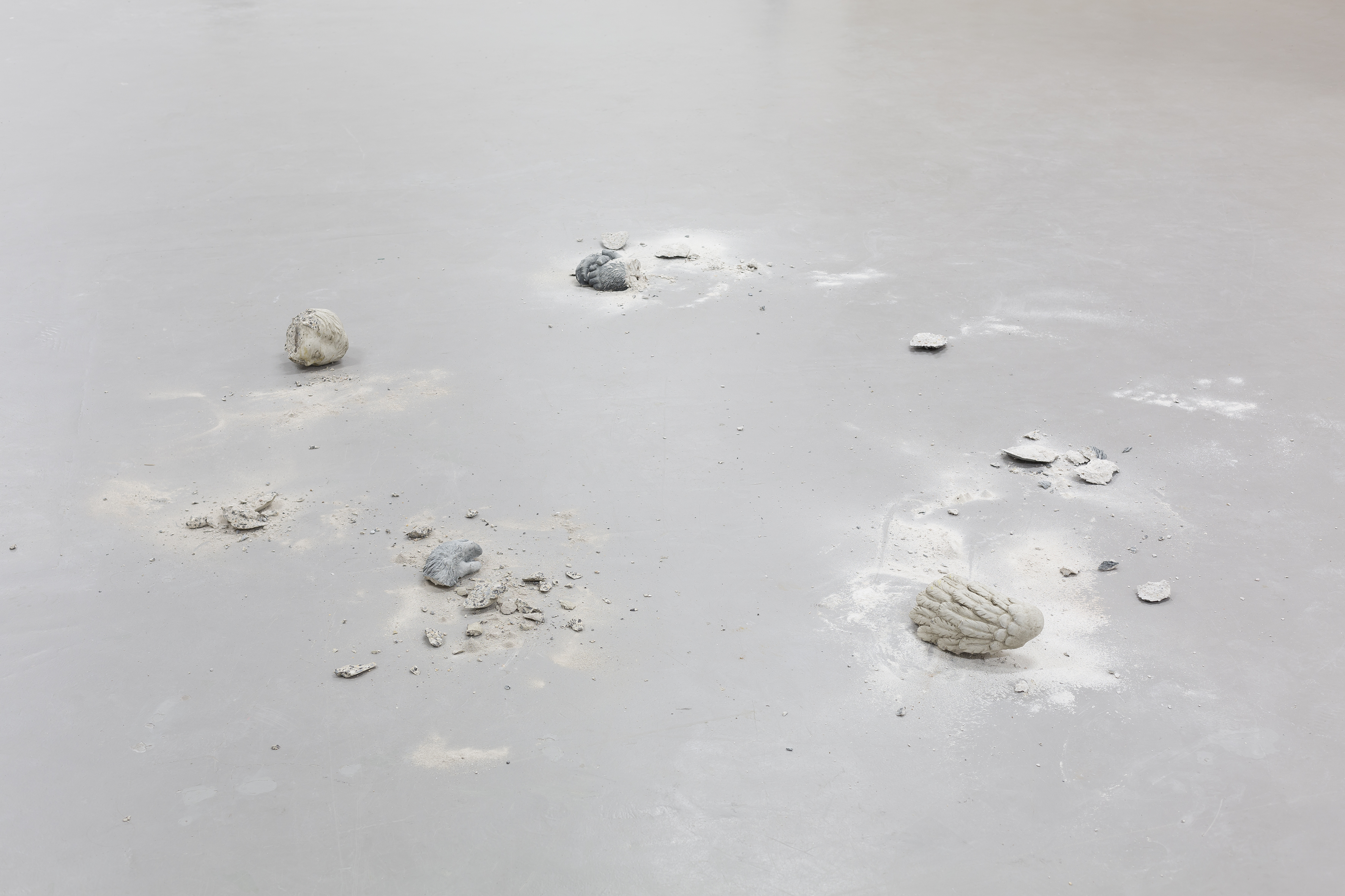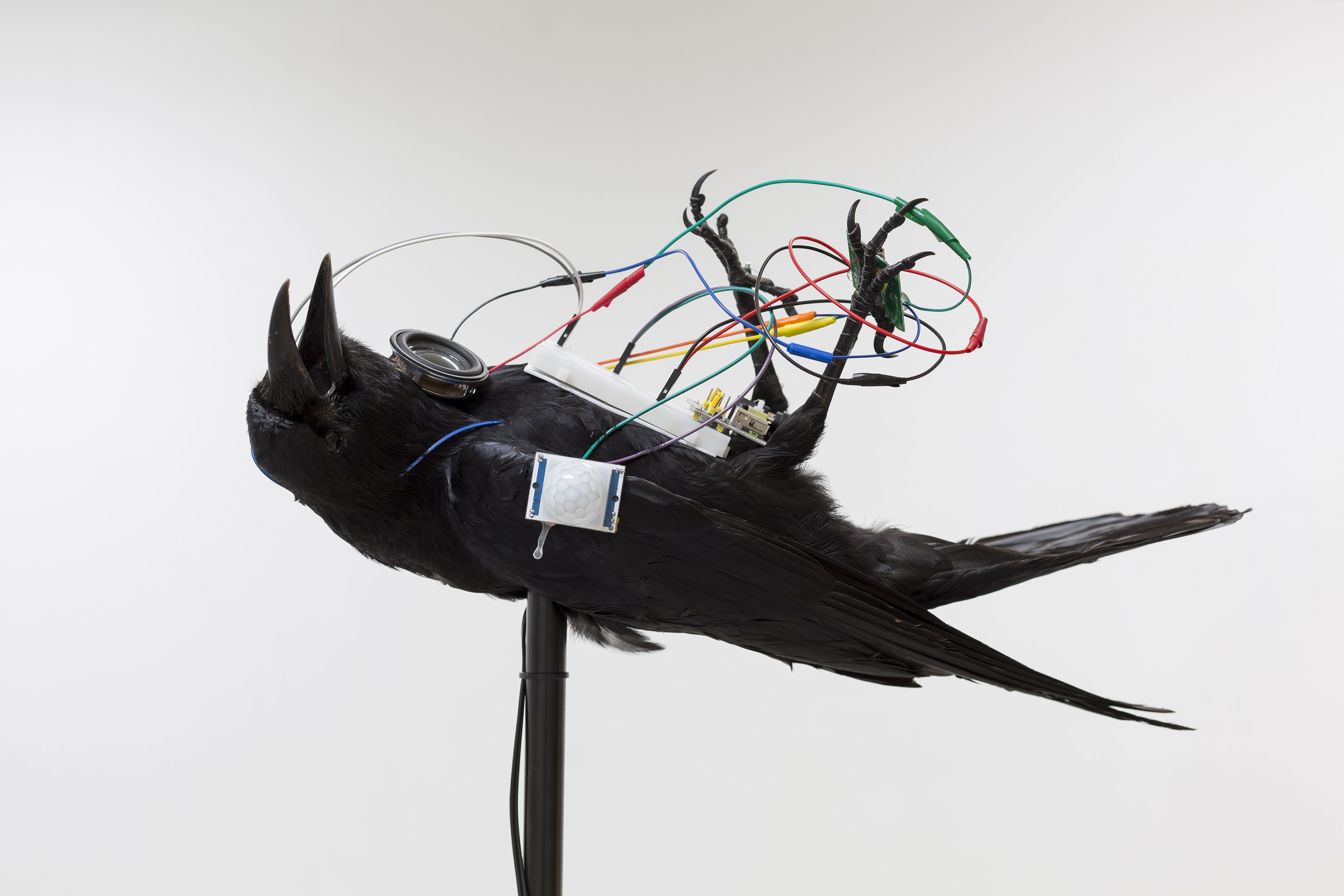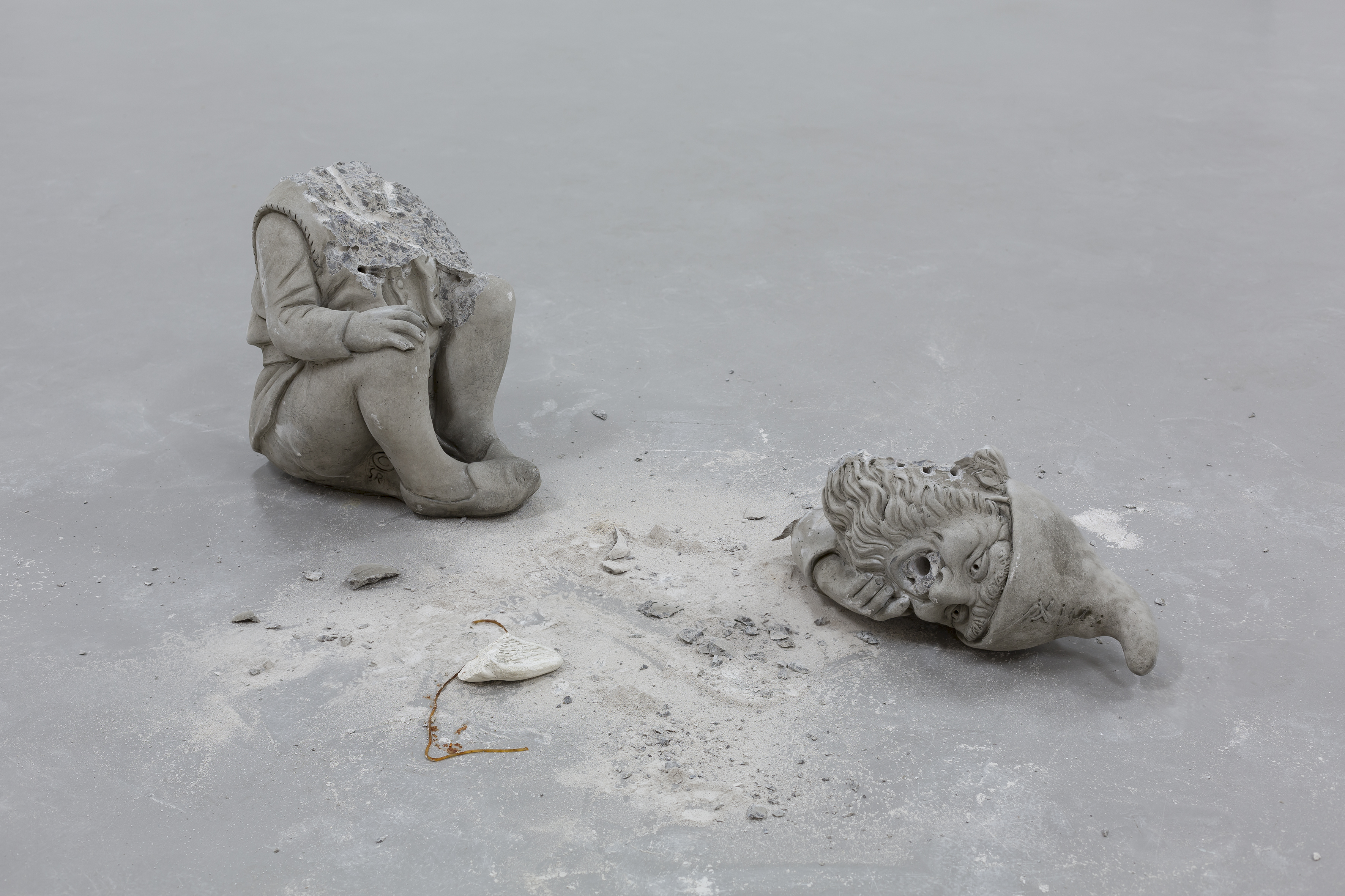 Three reanimated crows – inspired by their plastic lookalikes placed in gardens to scare away pigeons, and animatronics found in haunted house rides – 'greet' the visitor as they cross the threshold and wander through the exhibition space; turning them into an intruder. Within the space, the crows create a domain of privacy and secrecy that is inherent to most backyards. The electronics, attached on the outside of the birds instead of being concealed within, function as external organs meant to force the stuffed crows to speak. It is a single voice, belonging to one crow, that echoes its way through the second and has almost disappeared by the time it reaches the third. Backed into the corner, slightly lifted from the floor, stands the untreated and vulnerable prefab garden house that, instead of providing a solution to survive in an inhospitable environment – like its predecessor the log cabin – has become a place associated with leisure, relaxation and daydreaming. A sanctuary from the outside world placed on the edge of the domestic sphere; a room at the end of the garden. Scattered across the floor lie chunks of concrete. The wings of an angel, a leprechaun’s head, the hands of a chimpanzee, Ganesha’s trunk: the remains of a carefully dissected group of garden statues. Fragments of bodies that are endlessly reproducible. Clones and copies not bound to time or space – degraded to decoration, reduced to kitsch. A strand of spaghetti covered in red sauce has fallen from above on top of the debris. Between the rubble, a series of ghostly holograms float. They seem to exist both inside the empty wooden house, as well as on its outside, in the centre of the exhibition space. These ‘Nine Proposals’ were created by cutting off the various body parts belonging to a selection of already existing garden statues: a Pharaoh, a dog, a Moai-head, an angel, Ganesha, a Xi’an warrior, a leprechaun, and a chimpanzee. Their severed torsos, limbs and heads were recombined and merged with a digital scan of the artist’s body, resulting in a series of monstrous figures; proposals for new garden statues.